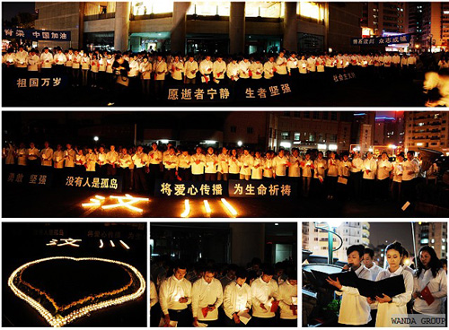 5月21日晚,万达集团举行了向汶川大地震遇难同胞致哀活动。8时整,从哈尔滨到南宁,从西安到上海,万达集团分布在全国30多个主要城市的126家分公司5000多名员工同时点亮蜡烛,为往生者默哀,为生者祈福。