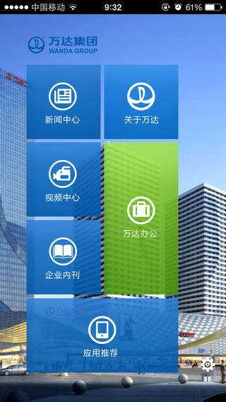 万达集团手机客户端是万达集团移动门户,包括苹果和安卓系统,是万达企业文化传播的新阵地,填补了集团宣传的一项空白。对外成为宣传新阵地,对内成为OA办公新利器。