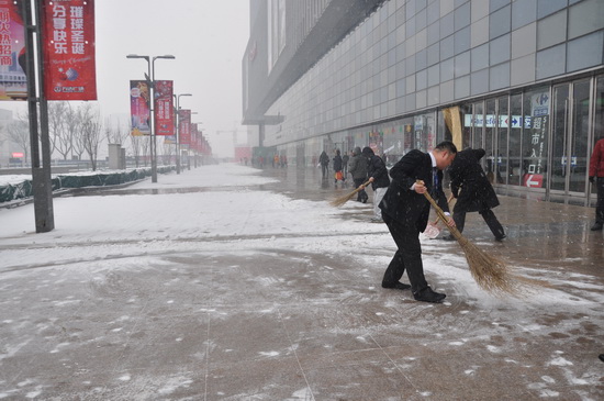 下雪就是集结号。根据廊坊商管公司事先制定的《扫雪铲冰突发事件处理预案》, 早上7:30,万达廊坊商管公司所有员工于东广场2号门前集合完毕,由物管部统一分发扫雪工具,以各部门经理为责任人,按预案中划分的区域进行有序清理。由于万达广场占地面积广,而商管员工人员较少,平均分配到每个员工身上的除雪面积达到60多平方米,加上零下十多度的低温和湿滑的地面,使除雪工作更加艰难,商管员工们的手和脸都冻得通红,然而,这一切丝毫没有影响商管员工们的热情和工作效率,在总经理的带领下,商管员工们发扬了吃苦耐劳、顽强拼搏的战斗万达精神,大家团结协作,顶着严寒,将划分区内的积雪清扫干净。物管部也及时在清扫干净的外广场做好了防滑处理。上午10点,廊坊万达广场正常开门营业,没有一位顾客在万达广场因下雪而摔伤。商管员工热火朝天、干劲十足的扫雪身影也感染了顾客,他们纷纷投来了赞许的目光。许多金街的店铺工作人员也加入进来,自觉清理了门前积雪。